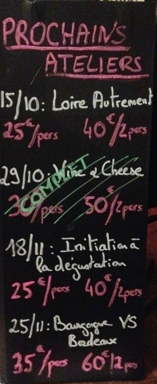 En plus d’une large sélection de vins blancs, rouges, rosés et champagne, Damien organise un mercredi sur deux, des cours de dégustation. Le thème varie à chaque fois. Le dernier cours auquel j’ai participé était consacré aux vins de Loire. Accordé avec quelques fromages du pays nantais, c’était parfait. La qualité était au rendez-vous, mais surtout c’est la découverte de vins qui m’était inconnu jusqu’ici que j’ai le plus apprécié.