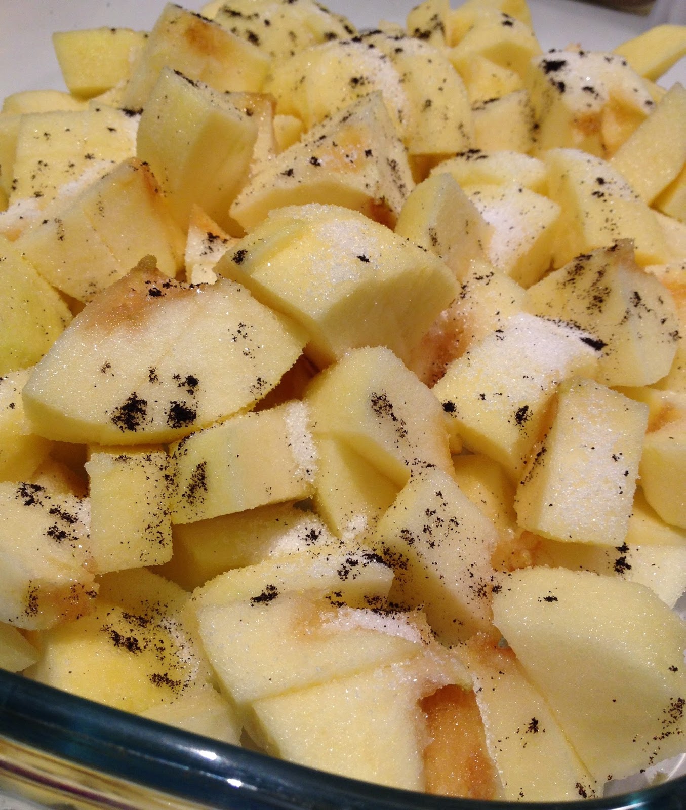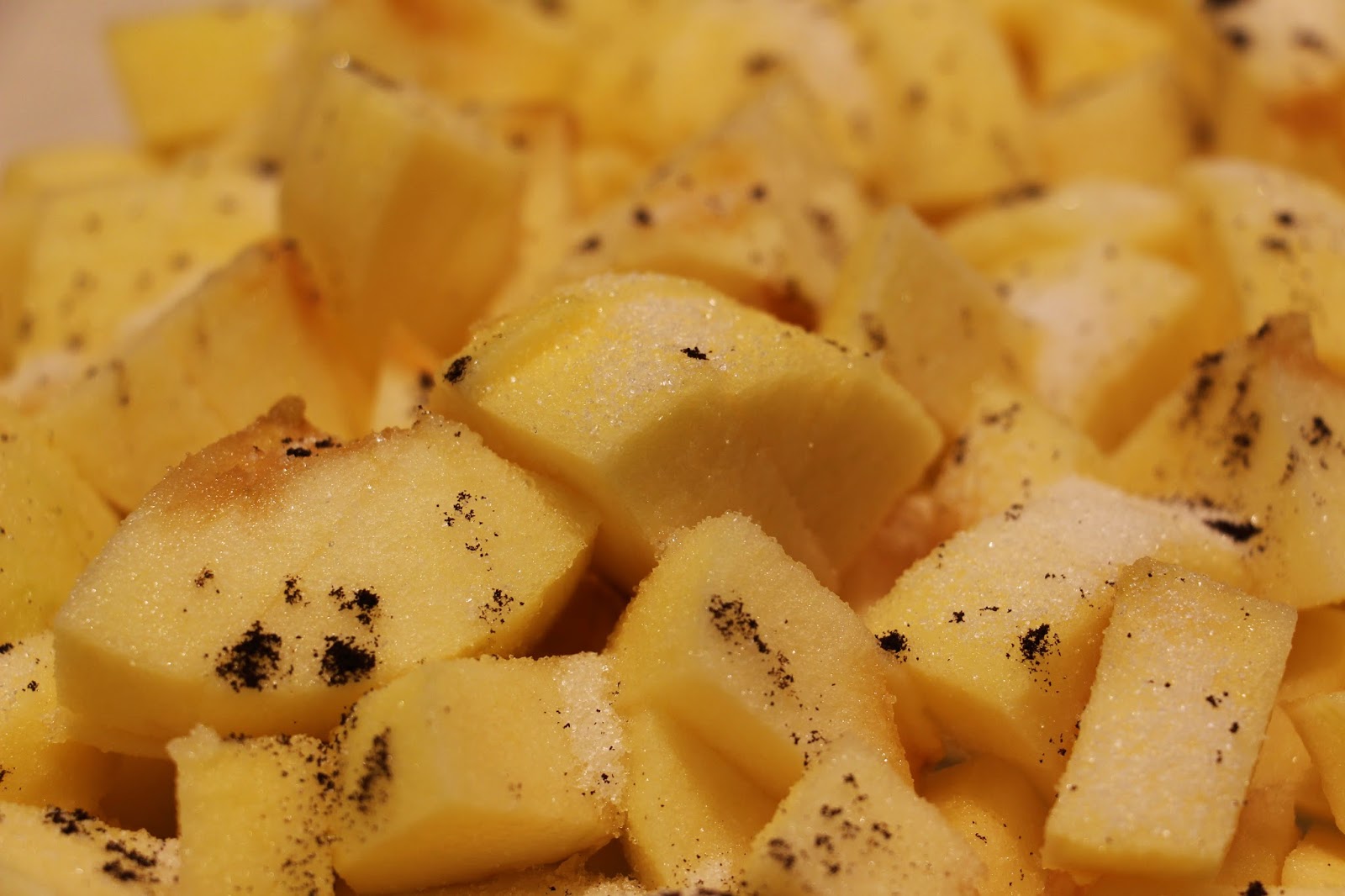 Disposez les dans un plat allant au four, puis saupoudrez les de sucre, éventuellement de gousse de vanille mixée et ajoutez quelques parcelles de beurre sur le dessus.