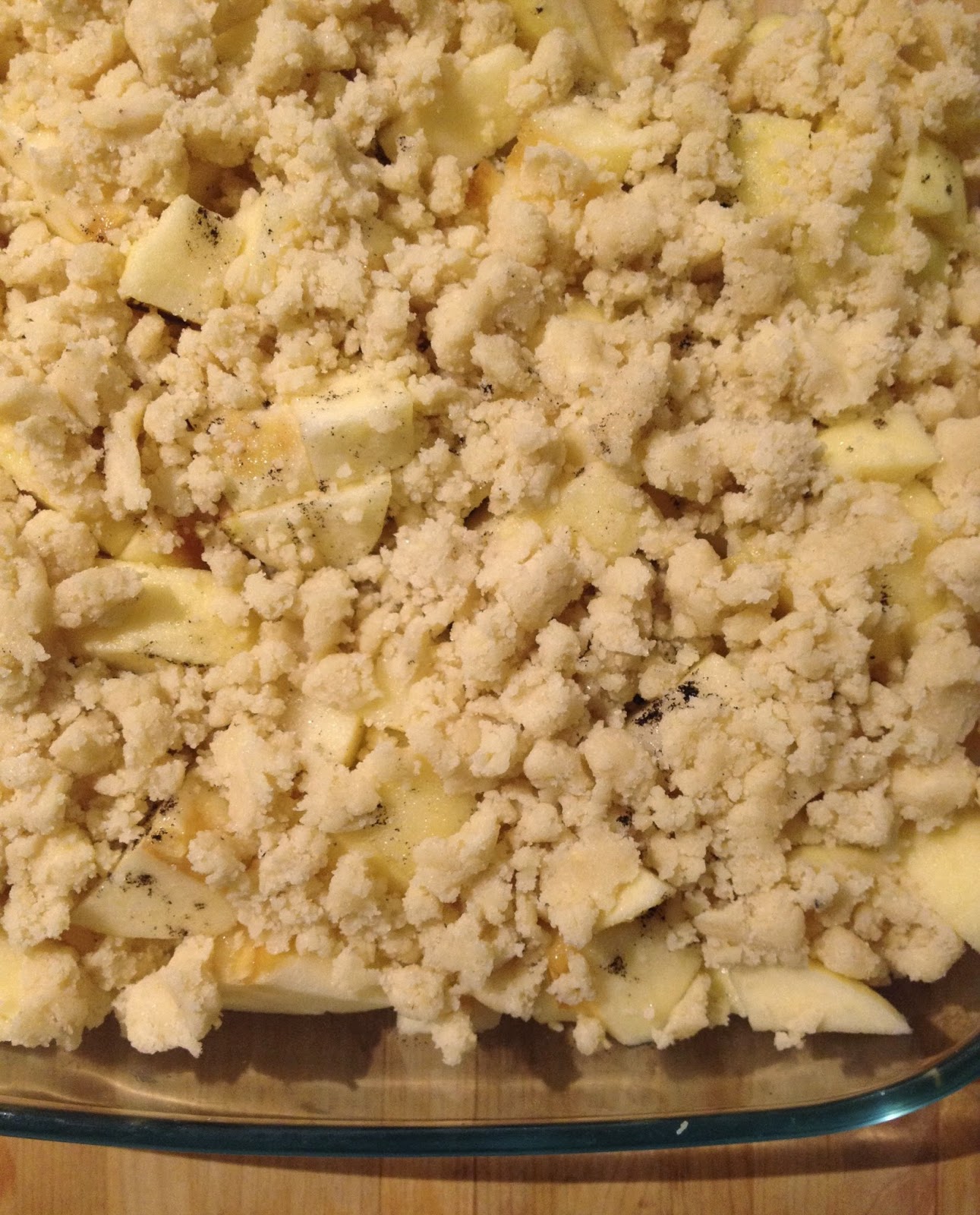 Émiettez la pâte à crumble sur toute la surface du plat, puis enfournez pour 45 minutes environ.